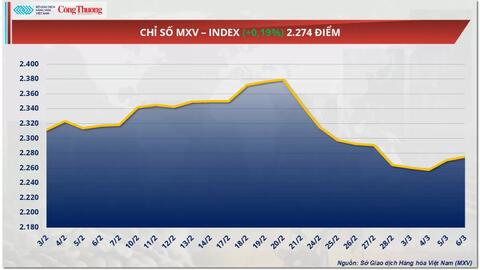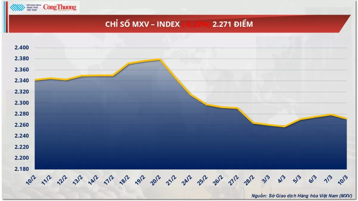Sở Giao dịch Hàng hóa Việt Nam (MXV) cho biết, sau ba phiên phục hồi, đóng cửa ngày hôm qua, lực bán chiếm ưu thế đã kéo chỉ số MXV-Index giảm 0,32% xuống mức 2.271 điểm. Trên thị trường năng lượng, giá dầu tiếp tục chịu áp lực trước lo ngại rằng chính sách thuế quan của Mỹ đối với hàng hóa từ Mexico, Canada và Trung Quốc. Đặc biệt, việc Mỹ áp lên Trung Quốc - khách hàng nhập khẩu đậu tương lớn nhất càng làm dấy lên lo ngại về triển vọng tiêu thụ mặt hàng này, qua đó, tác động mạnh lên thị trường nông sản.