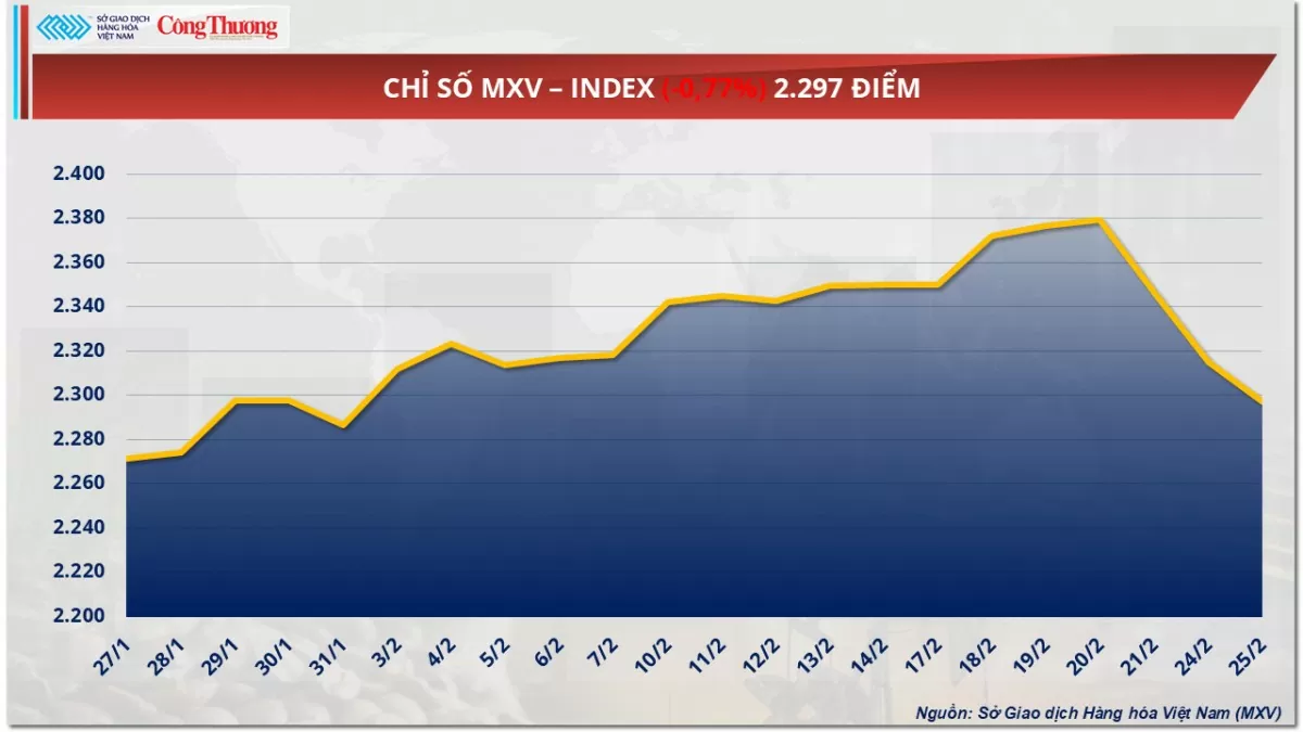Sở Giao dịch Hàng hóa Việt Nam (MXV) cho biết sắc đỏ bao phủ thị trường hàng hóa nguyên liệu thế giới trong phiên giao dịch ngày hôm qua (25/2). Lực bán rất mạnh đã kéo chỉ số MXV-Index rơi thêm 0,77% xuống 2.297 điểm - mức thấp nhất trong vòng gần một tháng qua. Đáng chú ý, hầu hết các mặt hàng trong nhóm năng lượng đều đồng loạt giảm giá trước những lo ngại về nhu cầu tiêu thụ năng lượng. Bên cạnh đó, giá kim loại cũng suy yếu và áp lực bán gia tăng.