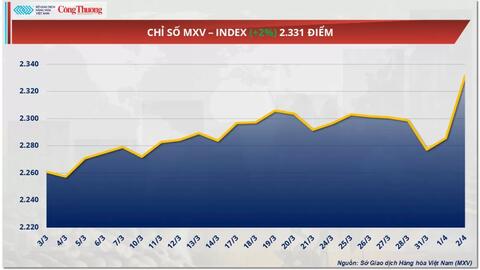 Sở Giao dịch Hàng hóa Việt Nam (MXV) cho biết thị trường hàng hóa nguyên liệu thế giới phản ứng mạnh mẽ sau khi Tổng thống Mỹ Donald Trump công bố chính sách thuế đối ứng. Bảng giá tràn ngập sắc đỏ, lực bán áp đảo đẩy chỉ số MXV-Index rơi 3% xuống 2.261 điểm. Chỉ sau một phiên neo trên vùng 2.300 điểm, sự kiện này đã đẩy chỉ số giá hàng hóa lao về mốc thấp nhất kể từ đầu tháng 3.