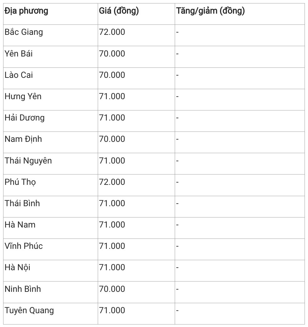 Hiện giá heo hơi khu vực này duy trì trong khoảng 70.000 - 72.000 đồng/kg. Trong đó, Phú Thọ và Bắc Giang là 2 địa phương có giá heo hơi cao nhất khu vực với 72.000 đồng/kg. Còn Lào Cai, Nam Định và Ninh Bình là hai địa phương có giá thấp nhất khu vực, cùng giao dịch tại mức 70.000 đồng/kg. Các tỉnh còn lại giao dịch ở mốc 71.000 đồng/kg.
