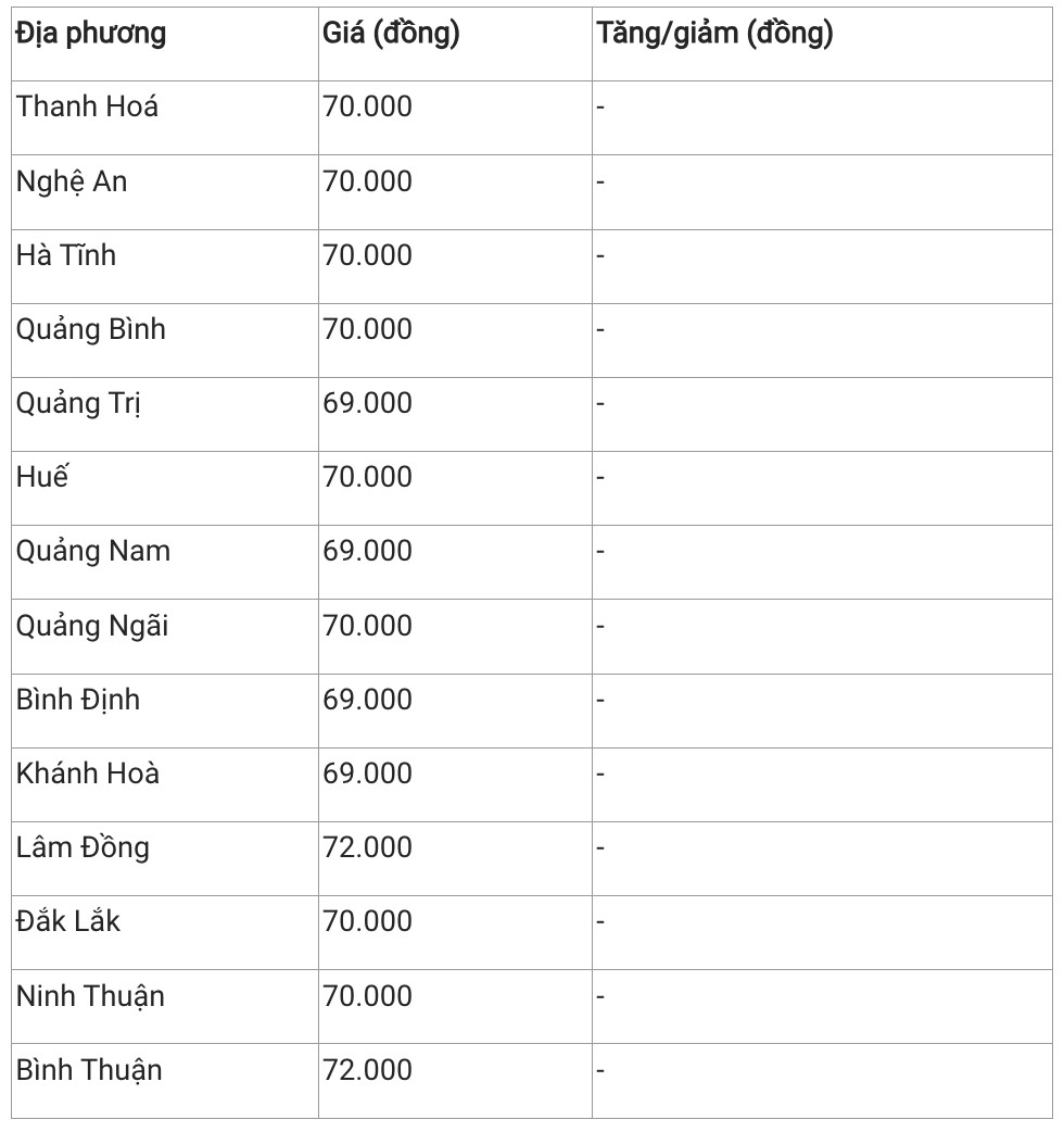 Hiện, giá heo hơi khu vực này dao động trong khoảng 69.000 – 72. 000 đồng/kg. Trong đó, Quảng Trị, Quảng Nam, Khánh Hoà, Bình Định bán heo hơi thấp nhất khu vực với mức 69.000 đồng/kg. Ngược lại, Bình Thuận và Lâm Đồng có giá heo hơi cao nhất khu vực với 72.000 đồng/kg. Các tỉnh còn lại giao dịch ở mốc 70.000 đồng/kg.