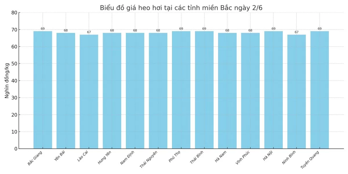 Biểu đồ giá heo hơi tại các tỉnh miền Bắc ngày 2/6.