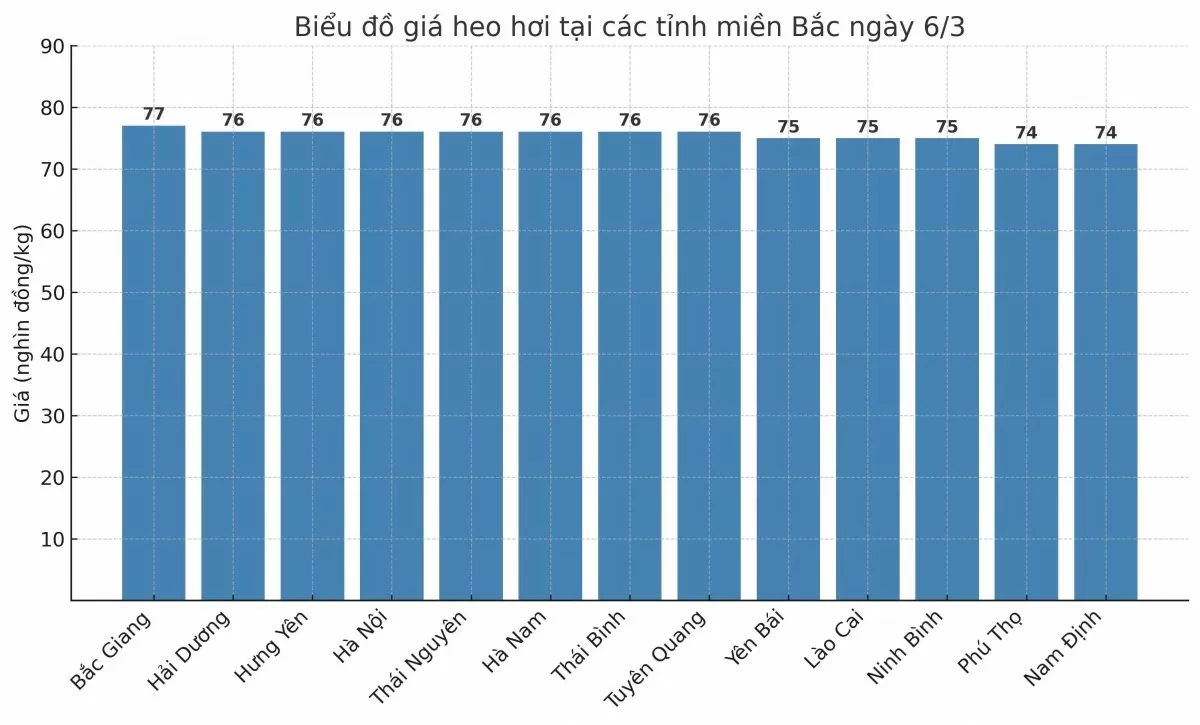 Tại miền Bắc, giá heo hơi ngày 6/3 tiếp tục xu hướng tăng nhẹ, trong đó Bắc Giang ghi nhận mức tăng mạnh nhất với 77.000 đồng/kg, cao hơn 2.000 đồng/kg so với ngày trước đó. Nhiều địa phương như Hải Dương, Hưng Yên, Hà Nội cũng tăng 1.000 đồng/kg lên mức 76.000 đồng/kg.