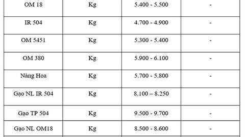 Với mặt hàng gạo, theo cập nhật từ Sở Nông nghiệp và Môi trường tỉnh An Giang, hiện gạo nguyên liệu xuất khẩu OM 380 giảm 50 đồng/kg dao động ở mức 7.950 - 8.050 đồng/kg; gạo nguyên liệu xuất khẩu OM 5451 giảm 100 đồng/kg dao động ở mức 8.400 - 8.500 đồng/kg; gạo nguyên liệu xuất khẩu IR 504 dao động ở mức 8.100 - 8.250 đồng/kg; gạo nguyên liệu xuất khẩu CL 555 dao động ở mức 8.150 - 8.250 đồng/kg; gạo nguyên liệu OM 18 dao động ở mức 8.500 - 8.600 đồng/kg; gạo thành phẩm OM 380 dao động ở 8.800 - 9.000 đồng/kg; gạo thành phẩm IR 504 dao động ở 9.500 - 9.700 đồng/kg.