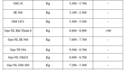 Tương tự với mặt hàng gạo, theo cập nhật từ Sở Nông nghiệp và Môi trường tỉnh An Giang và Lúa gạo Việt, hiện gạo Đài Thơm 8 dao động 8.600 - 8.900 đồng/kg; gạo nguyên liệu xuất khẩu OM 380 dao động ở mức 7.200 - 7.300 đồng/kg; gạo nguyên liệu xuất khẩu Sóc dẻo dao động ở mức 7.600 - 7.800; gạo nguyên liệu xuất khẩu IR 504 dao động ở mức 7.600 - 7.700 đồng/kg; gạo nguyên liệu xuất khẩu OM 5451 dao động ở mức 7.950 - 8.100 đồng/kg; gạo nguyên liệu xuất khẩu CL 555 dao động ở mức 7.600 - 7.800 đồng/kg; gạo nguyên liệu xuất khẩu OM 18 dao động ở mức 8.500 - 8.600 đồng/kg; gạo thành phẩm IR 504 dao động ở 9.500 - 9.700 đồng/kg so với hôm qua.