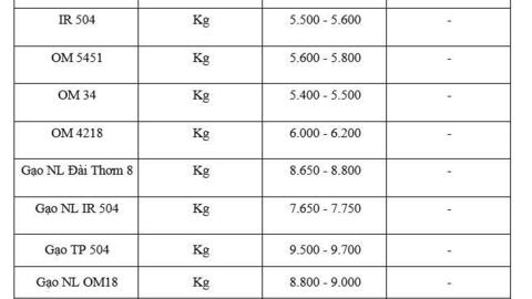 Với mặt hàng gạo, theo cập nhật từ Sở Nông nghiệp và Môi trường tỉnh An Giang và Lúa gạo Việt, hiện gạo nguyên liệu xuất khẩu CL 555 dao động ở mức 8.100 - 8.200 đồng/kg; gạo nguyên liệu xuất khẩu OM 18 dao động ở mức 8.800 - 9.000 đồng/kg; gạo nguyên liệu xuất khẩu OM 380 dao động ở mức 7.600 - 7.770 đồng/kg; gạo nguyên liệu xuất khẩu OM 5451 dao động ở mức 8.800 - 8.900 đồng/kg; gạo Đài Thơm 8 dao động 8.650 - 8.800 đồng/kg; gạo nguyên liệu xuất khẩu IR 504 dao động ở mức 7.650 - 7.750 đồng/kg; gạo nguyên liệu xuất khẩu Sóc thơm dao động ở mức 7.500 - 7.600; gạo thành phẩm IR 504 dao động ở 9.500 - 9.700 đồng/kg so với hôm qua.