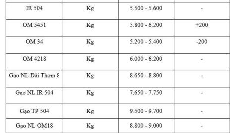 Với mặt hàng gạo, theo cập nhật từ Sở Nông nghiệp và Môi trường tỉnh An Giang và Lúa gạo Việt, hiện gạo nguyên liệu xuất khẩu CL 555 dao động ở mức 8.100 - 8.200 đồng/kg; gạo nguyên liệu xuất khẩu OM 18 dao động ở mức 8.800 - 9.000 đồng/kg; gạo nguyên liệu xuất khẩu OM 380 dao động ở mức 7.600 - 7.770 đồng/kg; gạo nguyên liệu xuất khẩu OM 5451 dao động ở mức 8.800 - 8.900 đồng/kg; gạo Đài Thơm 8 dao động 8.650 - 8.800 đồng/kg; gạo nguyên liệu xuất khẩu IR 504 dao động ở mức 7.650 - 7.750 đồng/kg; gạo nguyên liệu xuất khẩu Sóc thơm dao động ở mức 7.500 - 7.600; gạo thành phẩm IR 504 dao động ở 9.500 - 9.700 đồng/kg so với hôm qua.