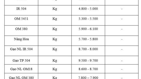 Trong đó với mặt hàng gạo, theo cập nhật từ Sở Nông nghiệp và Môi trường tỉnh An Giang, hiện gạo nguyên liệu xuất khẩu IR 504 giảm 50 đồng/kg dao động ở mức 7.600 - 7.800 đồng/kg; gạo nguyên liệu xuất khẩu Sóc dẻo giảm 100 đồng/kg  dao động ở mức 7.500 - 7.600; gạo nguyên liệu xuất khẩu OM 5451 dao động ở mức 7.950 - 8.100 đồng/kg; gạo nguyên liệu xuất khẩu CL 555 dao động ở mức 7.600 - 7.800 đồng/kg; gạo nguyên liệu xuất khẩu OM 18 dao động ở mức 8.500 - 8.600 đồng/kg; gạo nguyên liệu xuất khẩu OM 380 dao động ở mức 7.800 - 7.900 đồng/kg; gạo thành phẩm OM 380 dao động ở 8.800 - 9.000 đồng/kg; gạo thành phẩm IR 504 dao động ở 9.500 - 9.700 đồng/kg so với cuối tuần.