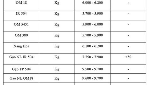 Tương tự với mặt hàng gạo, theo cập nhật từ Sở Nông nghiệp và Môi trường tỉnh An Giang, hiện gạo nguyên liệu xuất khẩu IR 504 giảm 50 đồng/kg dao động ở mức 7.700 - 7.850 đồng/kg; gạo nguyên liệu xuất khẩu CL 555 dao động ở mức 7.750 - 7.900 đồng/kg; gạo nguyên liệu xuất khẩu OM 5451 dao động ở mức 7.700 - 7.900 đồng/kg; gạo nguyên liệu xuất khẩu OM 380 dao động ở mức 8.200 - 8.300 đồng/kg; gạo nguyên liệu OM 18 dao động ở mức 9.600 - 9.700 đồng/kg; gạo thành phẩm OM 380 dao động ở 8.800 - 9.000 đồng/kg; gạo thành phẩm IR 504 dao động ở 9.500 - 9.700 đồng/kg.