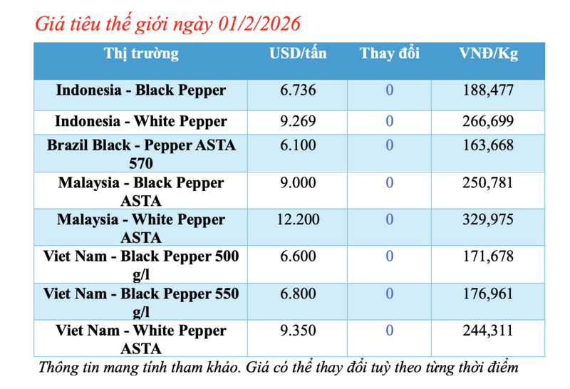 Cụ thể, giá tiêu đen Lampung của Indonesia được niêm yết ở mức 6.736 USD/tấn, không biến động so ngày hôm qua.