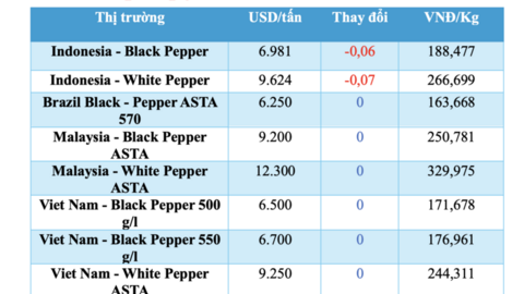 Tại Malaysia, giá tiêu đen ASTA hiện đang ổn định ở mức 9.200 USD/tấn. Giá tiêu trắng ASTA tại thị trường này trong ngày hôm nay đạt 12.300 USD/tấn, không biến động so với ngày hôm qua.