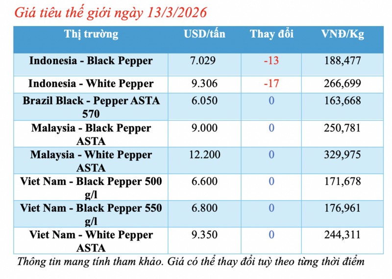 Cập nhật giá tiêu thế giới từ Hiệp hội Hồ tiêu Quốc tế (IPC) sáng 13/3, hồ tiêu xuất khẩu hôm nay tiếp tục ghi nhận biến động nhẹ từ thị trường Indonesia. Các thị trường khác đều duy trì mức giá ổn định so với phiên giao dịch trước.