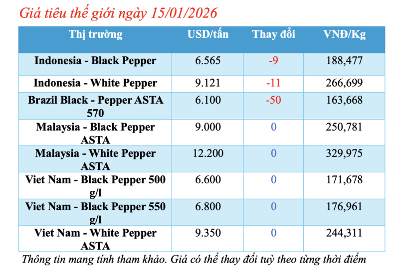 Cụ thể, giá tiêu đen Lampung của Indonesia được niêm yết ở mức 6.565 USD/tấn, giảm nhẹ 9 USD/tấn so với ngày hôm trước.