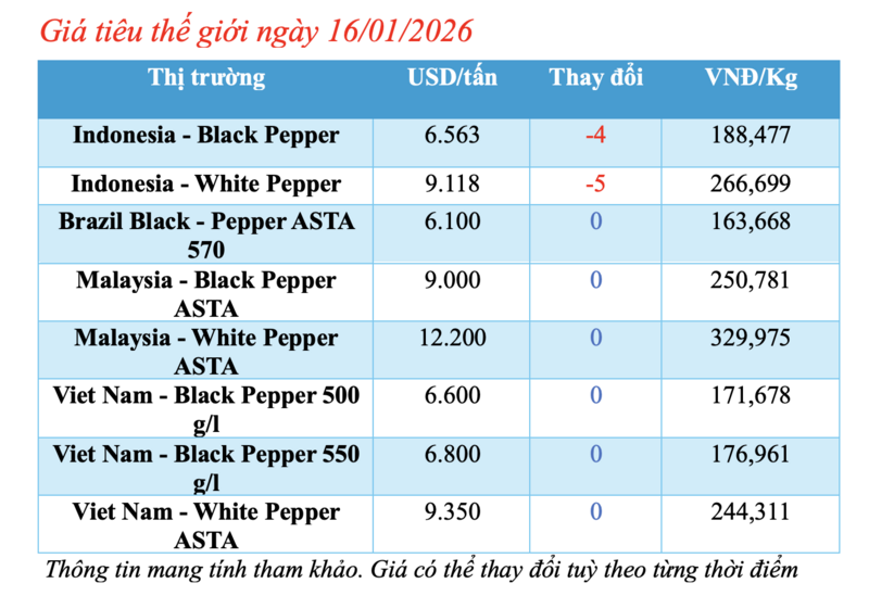 Cụ thể, giá tiêu đen Lampung của Indonesia được niêm yết ở mức 6.562 USD/tấn, giảm nhẹ 4 USD/tấn so với ngày hôm trước.
