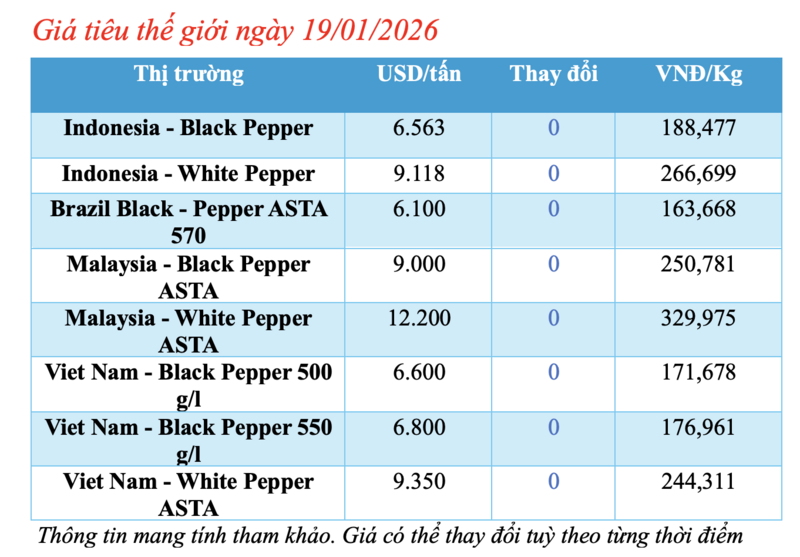 Cụ thể, giá tiêu đen Lampung của Indonesia được niêm yết ở mức 6.563 USD/tấn, không biến động so với ngày hôm trước.