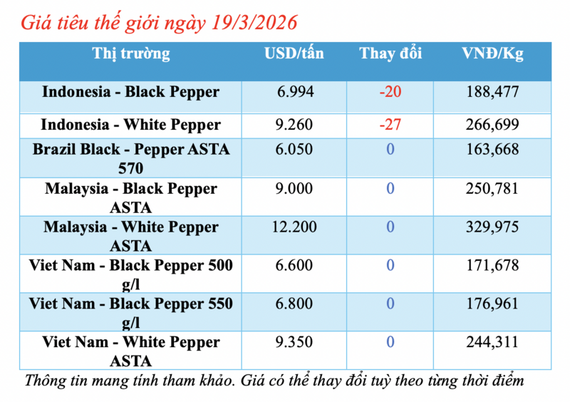 Cập nhật thị trường thế giới từ Hiệp hội Hồ tiêu Quốc tế (IPC) sáng 19/3, hồ tiêu xuất khẩu hôm nay ghi nhận biến động nhẹ từ thị trường Indonesia. Các thị trường khác đều duy trì mức giá ổn định so với phiên giao dịch trước.