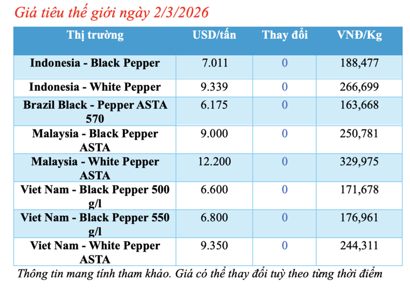 Tương tự, giá tiêu trắng Muntok của Indonesia cũng không thay đổi về giá so với ngày hôm qua, hiện đạt mức 9.339 USD/tấn.