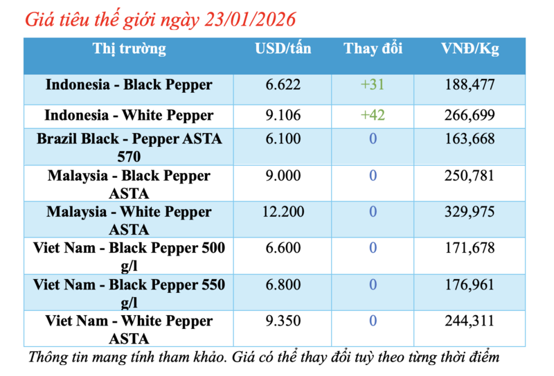 Cụ thể, giá tiêu đen Lampung của Indonesia được niêm yết ở mức 6.622 USD/tấn, tăng nhẹ 31 USD/tấn so ngày hôm qua.