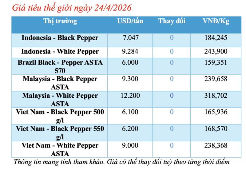 Cập nhật dữ liệu từ Hiệp hội Hồ tiêu Quốc tế (IPC) sáng 24/4/2026, hồ tiêu xuất khẩu hôm nay không ghi nhận phiên điều chỉnh mới. Các thị trường xuất khẩu hồ tiêu lớn đều duy trì mức giá ổn định.