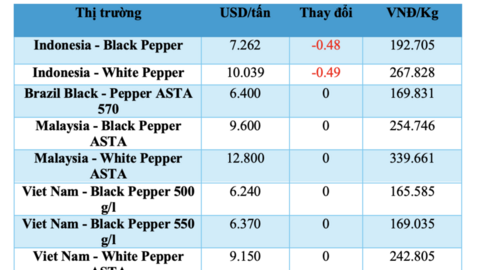 Nhìn chung, thị trường tiêu xuất khẩu Việt Nam ổn định so với phiên hôm qua. Hiện giá tiêu đen Việt Nam xuất khẩu loại 500 g/l đạt 6.370 USD/tấn; loại 550 g/l ở mức 6.370 USD/tấn và giá tiêu trắng đang ở mức 9.150 USD/tấn.