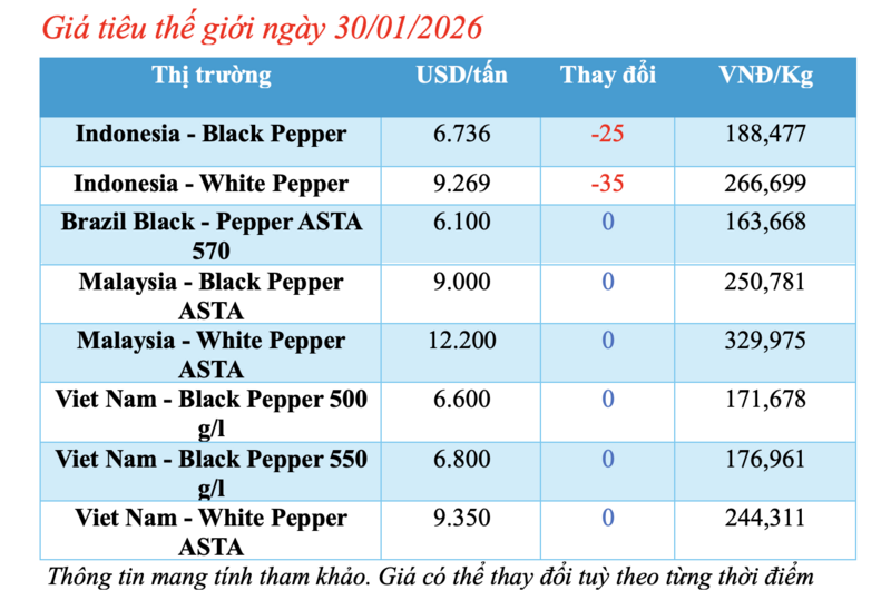 Tại Malaysia, giá tiêu đen ASTA hiện đang ổn định ở mức 9.000 USD/tấn. Giá tiêu trắng ASTA tại thị trường này trong ngày hôm nay đạt 12.200 USD/tấn, không biến động so với ngày hôm qua.