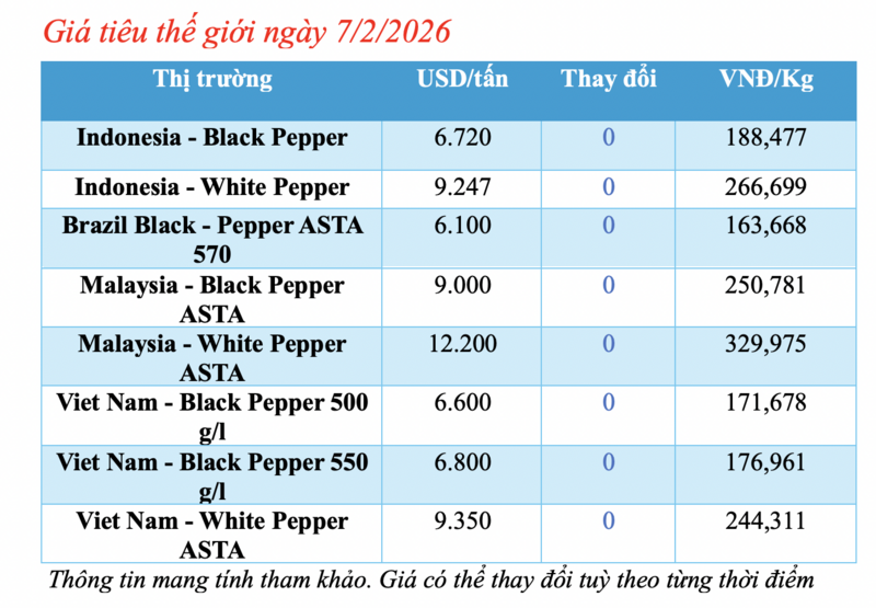 Giá tiêu đen của Việt Nam loại 500 gr/l đi ngang so với hôm qua, đạt mức 6.600 USD/tấn. Tiêu đen Việt Nam loại 550 gr/l đạt 6.800 USD/tấn.