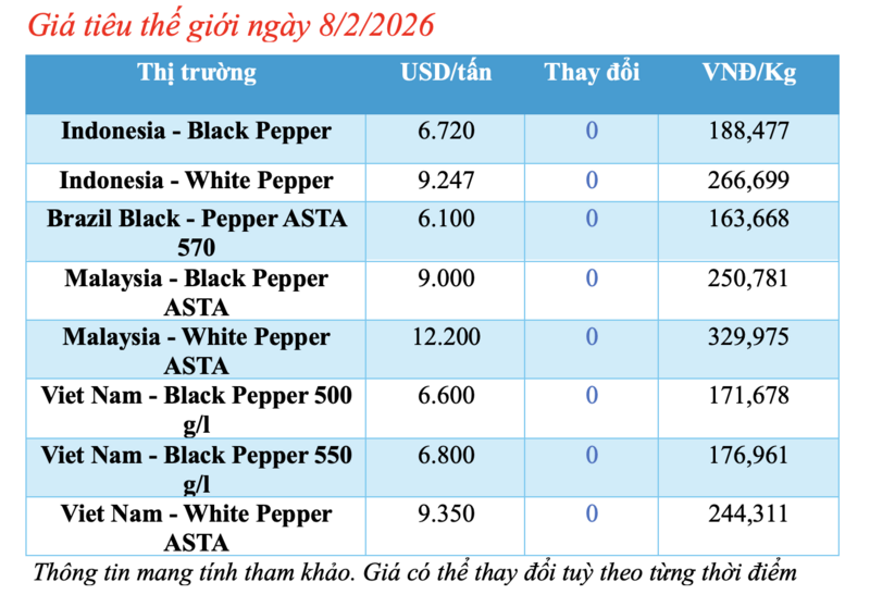 Tại Malaysia, giá tiêu đen ASTA hiện đang ổn định ở mức 9.000 USD/tấn. Giá tiêu trắng ASTA tại thị trường này trong ngày hôm nay đạt 12.200 USD/tấn, không biến động so với ngày hôm qua.