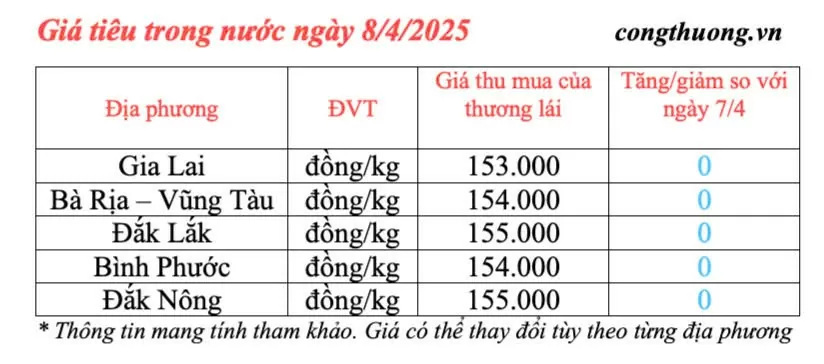 Giá tiêu hôm nay được cập nhật lúc 4h30 sáng ngày 8/4/2025 như sau, thị trường tiêu trong nước ổn định, đi ngang so với phiên giao dịch hôm qua. Hiện giá tiêu thu mua trung bình tại các địa bàn trọng điểm là 154.200 đồng/kg.