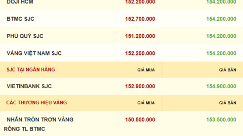 Giá vàng miếng được Công ty TNHH MTV Vàng bạc đá quý Sài Gòn - SJC, Bảo Tín Minh Châu, PNJ và Tập đoàn DOJI cùng niêm yết giá vàng ở mức 154,5 triệu đồng/lượng bán ra, giá vàng tăng 300.000 đồng/lượng ở cả hai chiều mua - bán so với chốt phiên giao dịch ngày hôm qua.