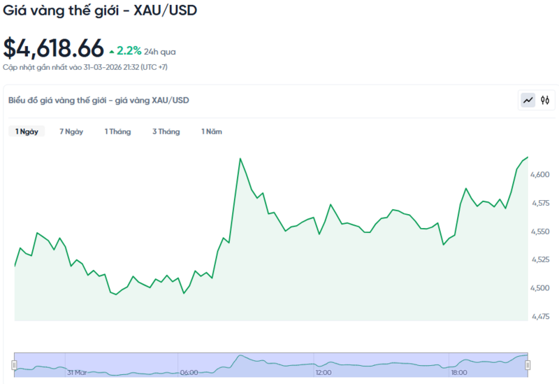 Theo Kitco, giá vàng thế giới ghi nhận lúc 4h30 hôm nay theo giờ Việt Nam giao ngay ở mức 4,618.66 USD/ounce. Giá vàng hôm nay tăng 2,2% so với hôm qua. Quy đổi theo tỷ giá USD trên thị trường tự do (26.922 VND/USD), vàng thế giới có giá khoảng 145 triệu đồng/lượng (chưa tính thuế, phí). Như vậy, giá vàng miếng SJC đang cao hơn giá vàng quốc tế khoảng 30 triệu đồng/lượng.