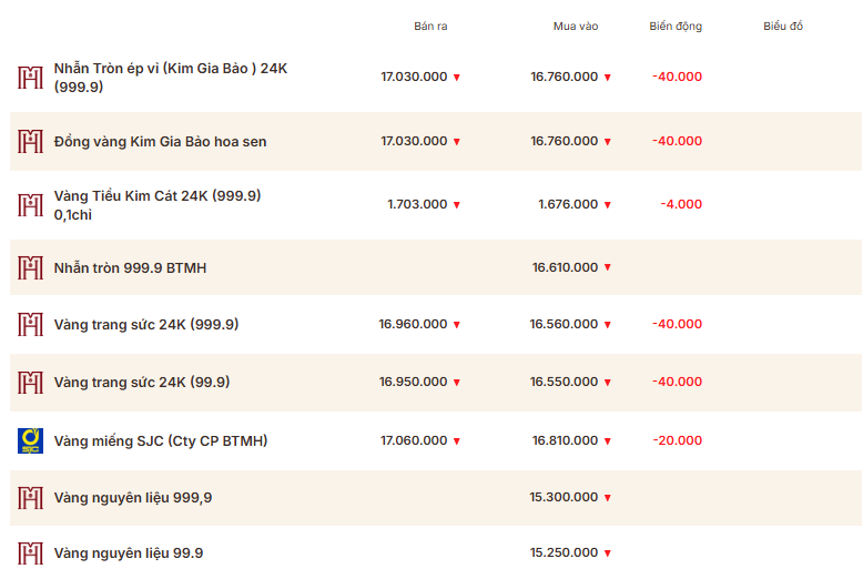 Bảo Tín Mạnh Hải niêm yết giá nhẫn tròn ép vỉ Kim Gia Bảo ở mức 167,6 - 170,6 triệu đồng/lượng (mua vào - bán ra), giảm 400.000 đồng/lượng cả hai chiều mua vào và bán ra so với chốt phiên giao dịch trước.