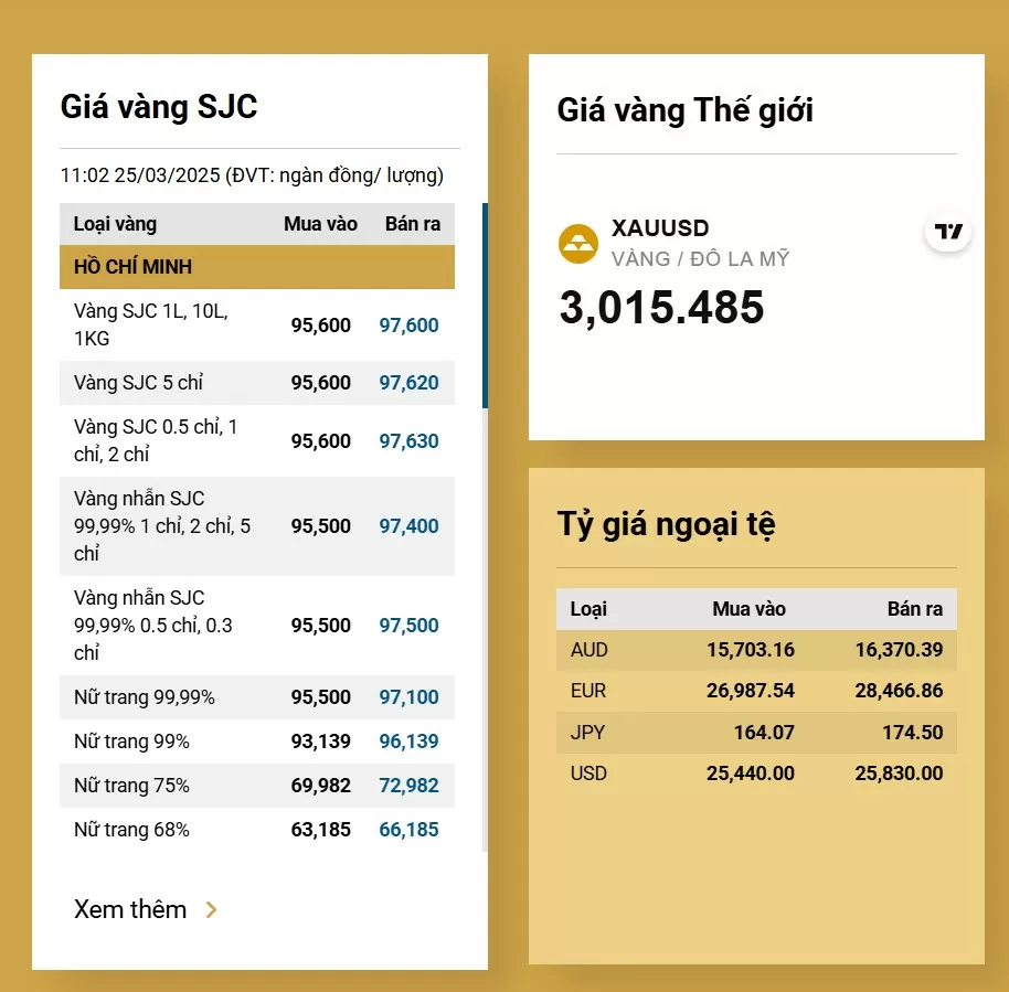 | Giá vàng hôm nay giảm theo đà giảm chung của giá vàng thế giới. Thời điểm 11h ngày 25/3, giá vàng thế giới đang đứng quanh ngưỡng 3.015 USD/ounce, tương đương 93,99 triệu đồng/lượng. |