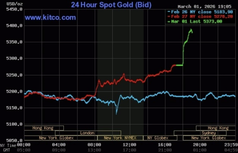 Mở cửa phiên giao dịch ngày 2/3, giá vàng thế giới giao ngay có thời điểm tăng hơn 100 USD lên 5.384 USD/ounce. Thị trường vàng tăng do căng thẳng địa chính trị leo thang, gây bất ổn kinh tế toàn cầu. Các chuyên gia nhận định giá vàng có thể tiếp tục lập đỉnh mới nếu tình hình xấu đi, trong khi giá dầu thô nhiều khả năng còn tăng thêm do lo ngại nguy cơ gián đoạn nguồn cung.