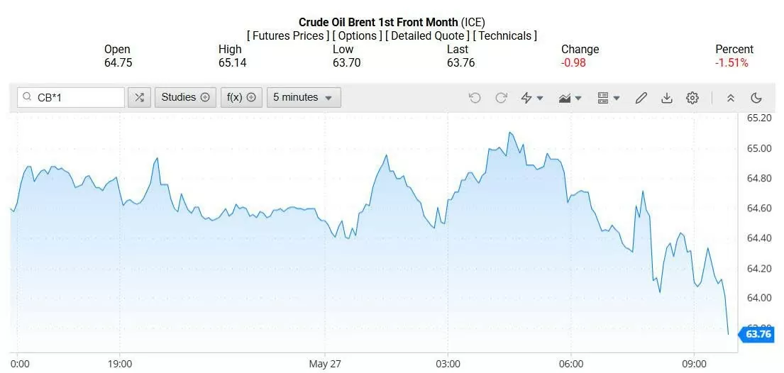 Ghi nhận trên Oilprice lúc 4h30 ngày 28/05/2025 (theo giờ Việt Nam), giá dầu Brent ở mốc 63,76 USD/thùng, giảm 1,51% (tương đương giảm 0,98 USD/thùng).
