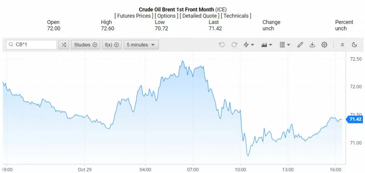 Ghi nhận trên Oilprice lúc 5h ngày 30/10/2024 (theo giờ Việt Nam), giá dầu WTI ở mốc 71,42 USD/thùng, tăng 0,31% (tương đương tăng 0,21 USD/thùng).