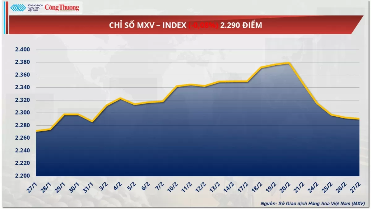 Sở Giao dịch Hàng hóa Việt Nam (MXV) cho biết, thị trường hàng hóa nguyên liệu thế giới diễn biến tương đối giằng co trong phiên giao dịch ngày hôm qua (27/2). Kết phiên, lực bán chiếm áp đảo đã kéo chỉ số MXV-Index giảm thêm 0,1% về 2.290 điểm - mức thấp nhất trong vòng gần một tháng qua. Nhóm năng lượng gây chú ý khi đi ngược với xu hướng chung của toàn thị trường. Trong đó, giá hai mặt hàng dầu thô quay đầu tăng mạnh sau khi Mỹ tuyên bố hủy chính sách hợp tác dầu mỏ với Venezuela. Ngược lại, sắc đỏ bao phủ thị trường nông sản khi diễn biến thời tiết Nam Mỹ tiến triển tốt.