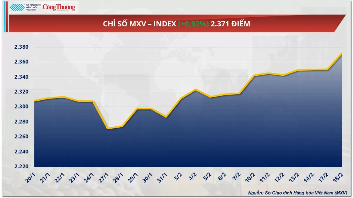 Theo Sở Giao dịch Hàng hóa Việt Nam (MXV), sắc xanh bao phủ thị trường hàng hóa nguyên liệu thế giới trong phiên giao dịch ngày hôm qua (18/2). Đặc biệt, trên thị trường năng lượng, 4 trên 5 mặt hàng đồng loạt tăng giá, trong đó, giá hai mặt hàng dầu thô bật tăng trước những lo ngại về tình trạng gián đoạn nguồn cung; giá khí tự nhiên cũng lên mức cao nhất trong ba tuần. Bên cạnh đó, nhóm nông sản cũng ghi nhận phiên giao dịch tích cực sau kỳ nghỉ lễ. Đóng cửa, lực mua áp đảo đã kéo chỉ số MXV-Index tăng 0,92% lên 2.371 điểm - mốc đỉnh kể từ cuối tháng 5/2024.