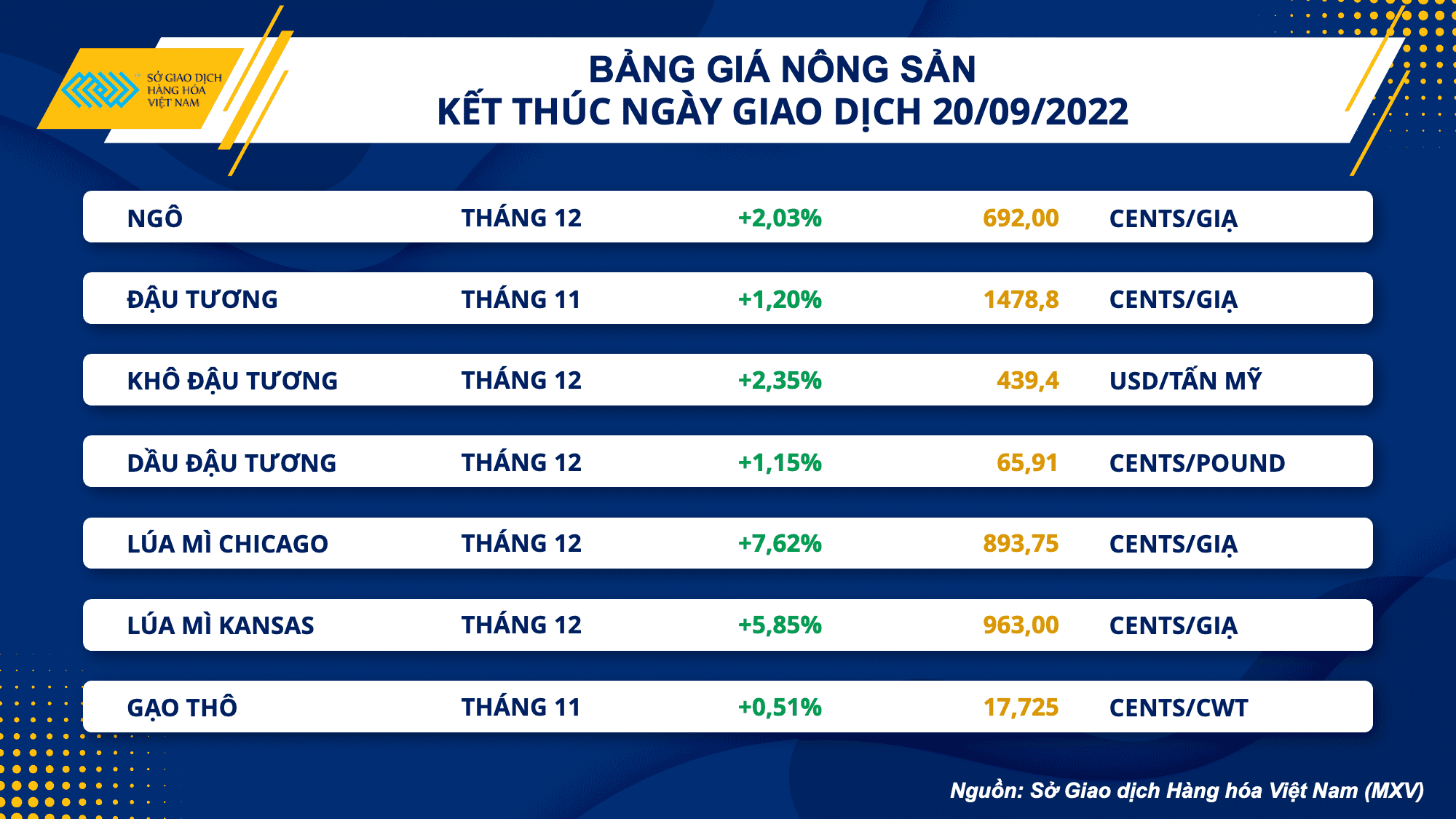 Thị trường hàng hóa ngày 21/9, tăng nhẹ ngày thứ 2 liên tiếp. Lực mua chủ yếu đến từ nhóm nông sản, với toàn bộ 7/7 mặt hàng đồng loạt tăng giá.