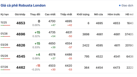 Giá cà phê Arabica tăng hơn 2% lên mức 9.118 USD/tấn - tiến sát mức cao nhất hồi giữa tháng 10; trong khi giá cà phê Robusta cũng tăng 0,1% lên mức 4.686 USD/tấn.