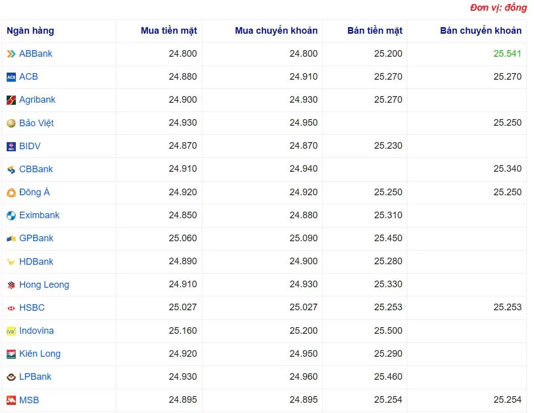 Ngân hàng ABBank đang bán chuyển khoản USD với giá cao nhất là: 1 USD = 25.541 VND