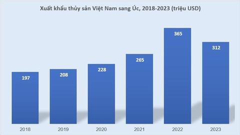 Sau khi CPTPP có hiệu lực, xuất khẩu thủy sản của Việt Nam sang Australia tăng trưởng liên tục từ 197 triệu USD năm 2018 lên 365 triệu USD năm 2022. Trong bối cảnh sụt giảm chung của thế giới, kim ngạch xuất khẩu thủy sản sang thị trường này xuống mức 312 triệu USD năm 2023.